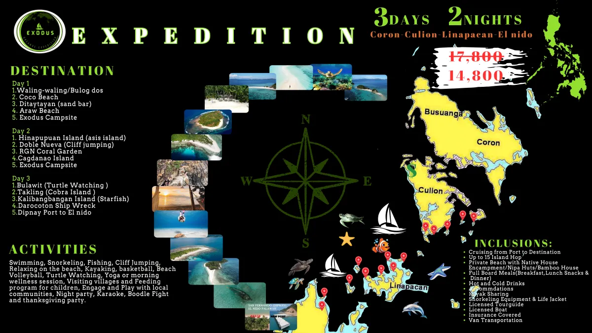 Things like personal items (towels, bug spray, sunscreen), music speakers, and tips for the crew are not included. Also, the Eco-Tourism Development Fees (ETDF) for El Nido and Coron aren’t covered.